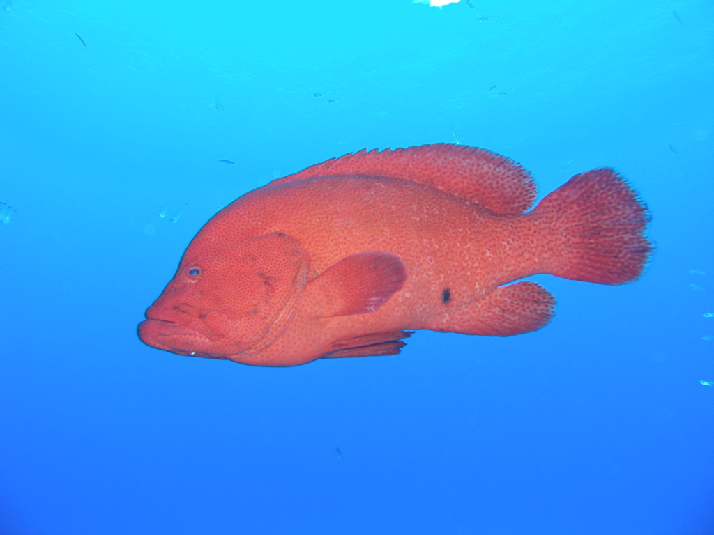 8:00 出航で念願のアザハタの根へ。 流れはなく、70mの中層遊泳は快適。 潜行後、打ち合せ通り、みんな 5m 手前で着底し、しばしワイドを撮る。