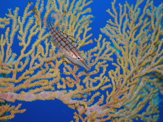 McCosker's flasher wrasse、クダゴンべなど一通り見た後、 最後にセダカギンポ出現。 もう粘る時間がなく、珊瑚から出て来るまで待てなかったので、 写真はこの程度。 下半身がオレンジの奇麗な個体だった。
