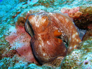 最後に三角錐の珊瑚に行ってみる。貝のような物が付いていて、よーく見るとタコだった。人慣れしているタコでたくさん写真が撮れた。