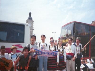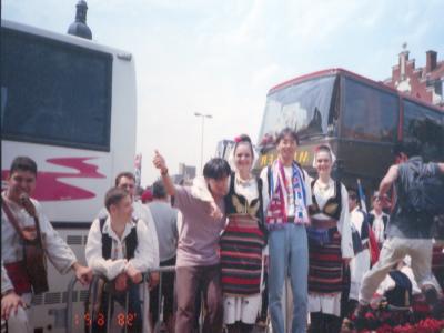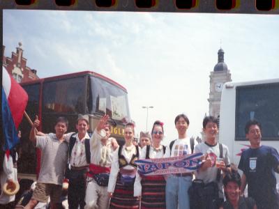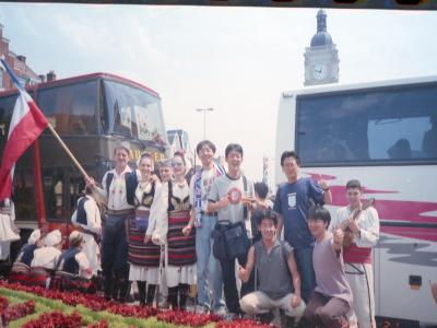 広場の外に大型バスが二台停止したので、なんだろうと思っていると、まるでおとぎの国からやってきたような民族衣装を着た人達が降りてきた。木製の靴は、尖った先が渦を巻いている。 どうもユーゴの応援団のようだ。「ピクシー、ピクシー」と叫んでみると、向うも僕達が日本人だと分ってくれた。